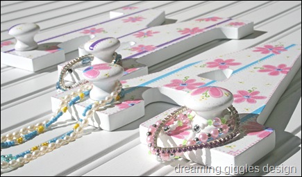This was fun! My daughter had a few friends with birthdays recently and this popped into my head as a fun and functional gift. My daughter loves her play jewelry, but the jewelry box seems to get cluttered really quickly! I thought these knobs on the letters would be a fun way for the girls to hang their favorites for easy access! Seriously, every 4 year old must accessorize!